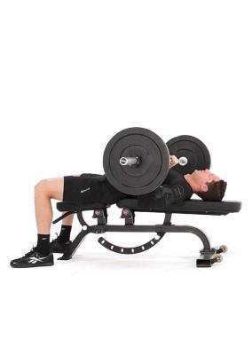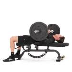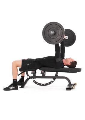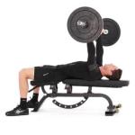 Paso 2:Baje la barra en forma recta controlando el movimiento. Asegúrese de mantener los codos doblados cerca de su cuerpo de manera que el brazo forme un ángulo de 45 grados con su cuerpo en la posición baja. Haga una pausa y luego empuje la barra en línea recta hasta la posición inicial.